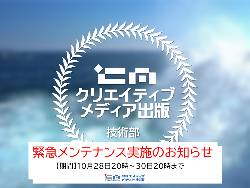 クリエイティブメディア出版・技術部です。 下記日程でサーバーの緊急メンテナンスを実施します。 【実施期間】10月28日14時~30日20時まで 【該当サーバー】パールハーバーライブ(BP) ご不便をお掛け致します。ご理解の程、宜しくお願い申し上げます。 以上 クリエイティブメディア出版・技術部